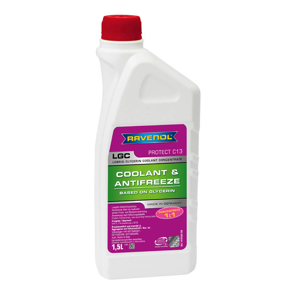 RAVENOL LGC Concentrate – охлаждающая жидкость концентрат на основе 1.2-Ethandiol (моноэтиленгликоля) с добавлением 20% глицерина и ингибиторов коррозии на базе силикатов с использованием органической технологии OAT. Не содержит бораты, нитриты, фосфаты. Обеспечивает долговременную (до 5 лет) антикоррозионную защиту алюминиевого двигателя как зимой, так и летом. Не опасен для окружающей среды.